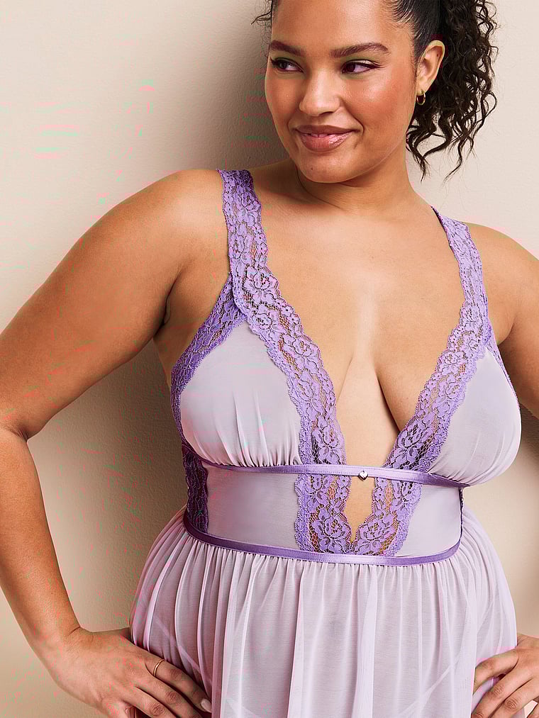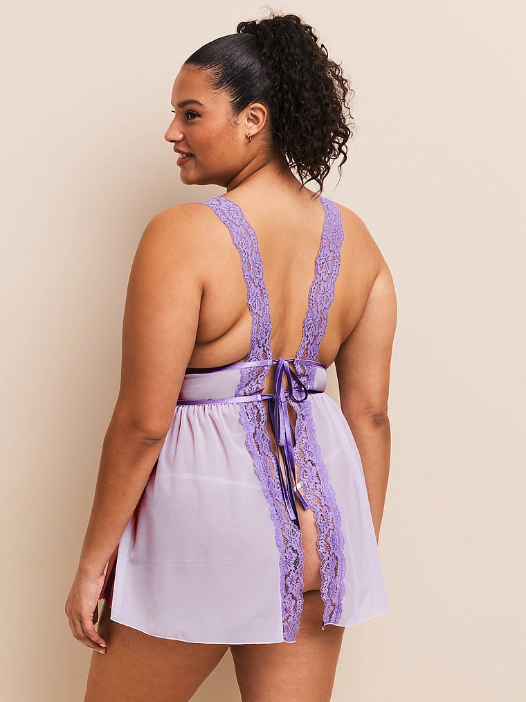 Ready for romance? This sheer Babydoll features unlined cups, lace trim at the neck and straps, and a peek-a-boo back.
