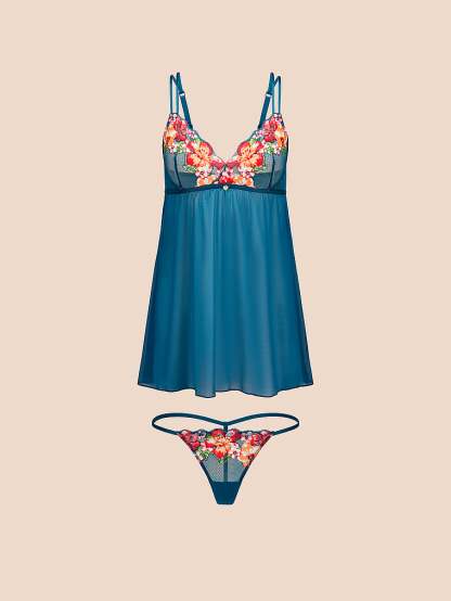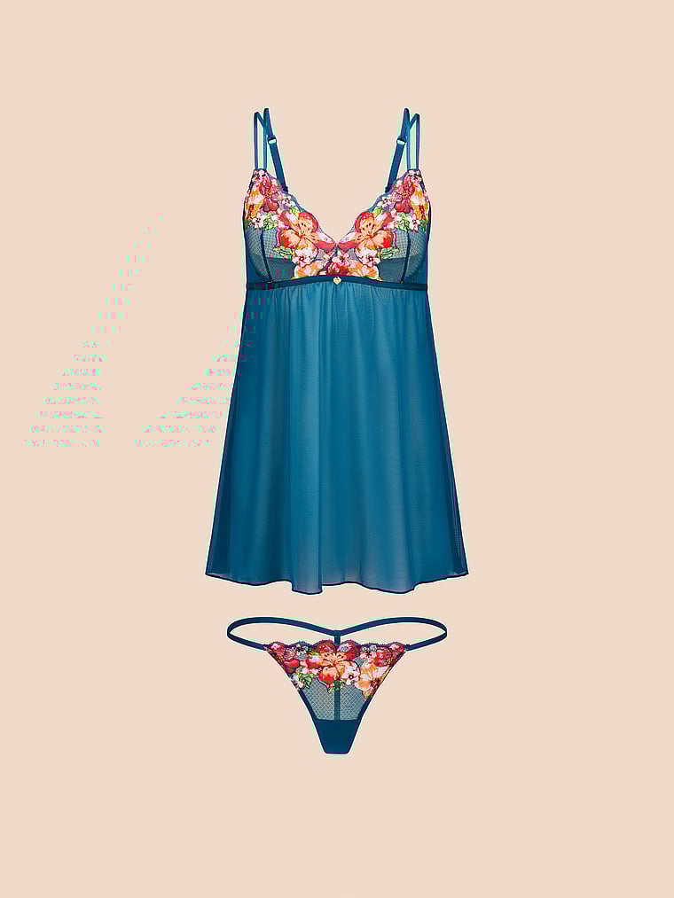 Playful and utterly romantic, this two-piece Babydoll set boasts sheer mesh and tropical floral lace. A supportive elastic underband and adjustable straps create a comfortable fit.