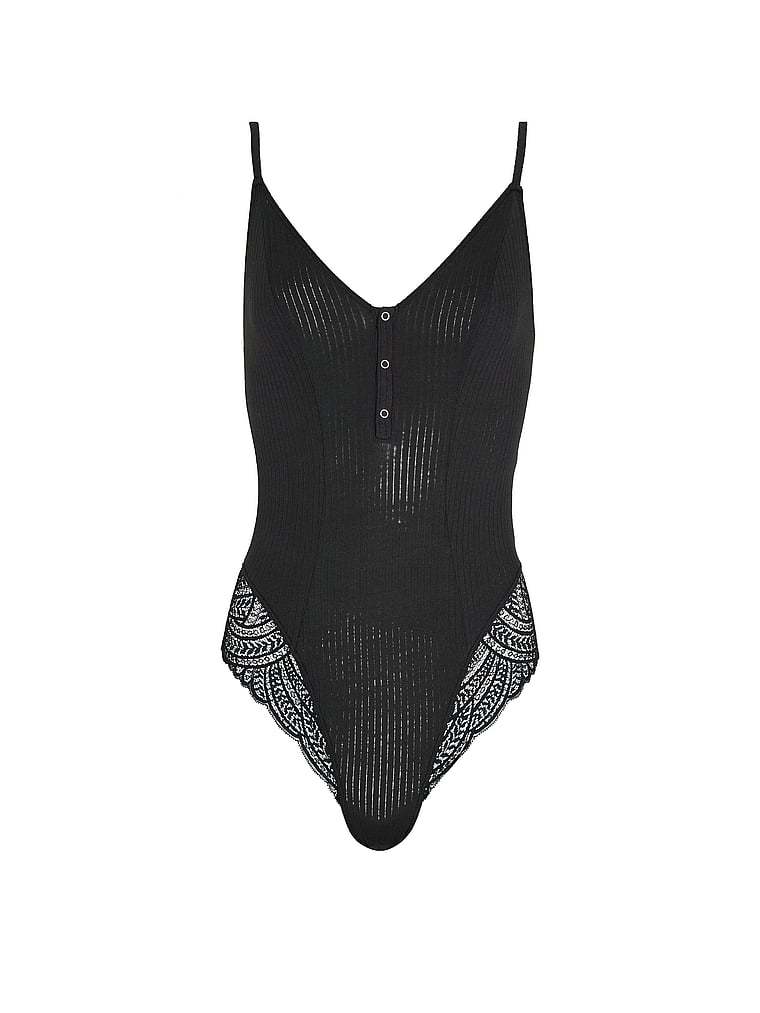 Rock this ultra-soft bodysuit with adjustable racerback straps and faux high-leg lace detailing anytime you want to feel cute and comfy. Perfect for lounging, layering, or even wearing as a sexy sleepwear piece.