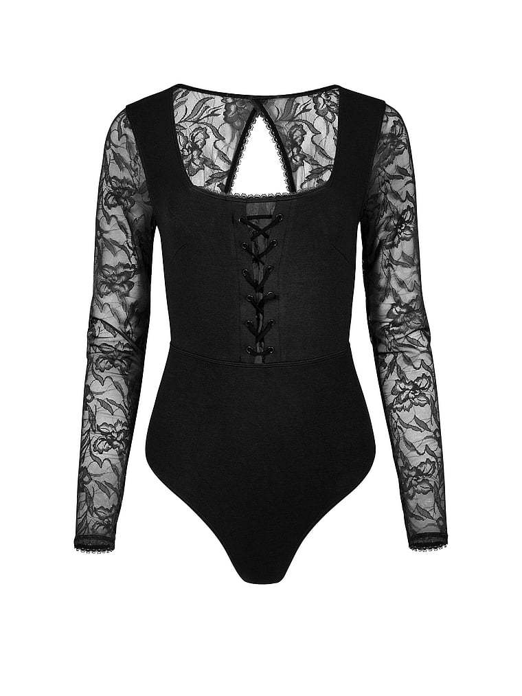 Pair this backless Bodysuit—made of a soft jersey knit with lace details and a lace-up front—with denim or a skirt for an ideal going out look.
