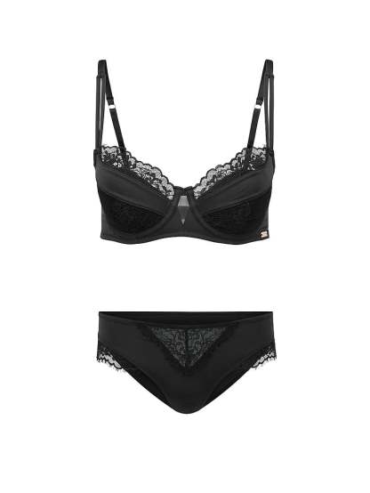 This classic black bra will make you feel confident. It is made of satin fabric with eyelash lace cups, an underwire, adjustable back straps, and the hook and eye closure.