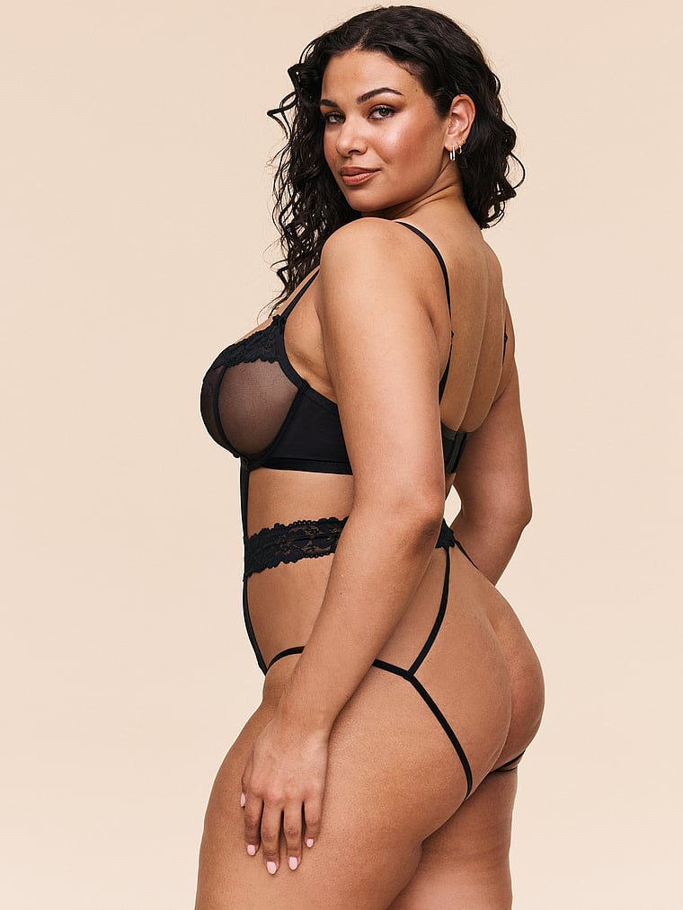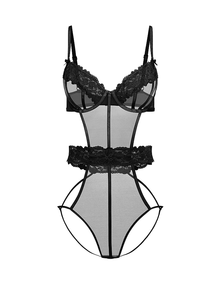 Hello, hotness. This completely sheer bodysuit has lace trim and a lace belt, plus underwire demi cups for a bit of lift.