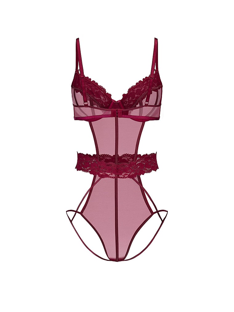 Hello, hotness. This completely sheer bodysuit has lace trim and a lace belt, plus underwire demi cups for a bit of lift.