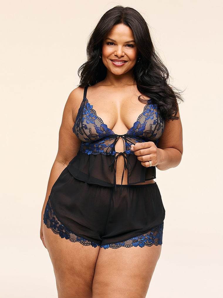 Dainty lace offsets sheer chiffon on this romantic set for an ultra-luxurious feel.