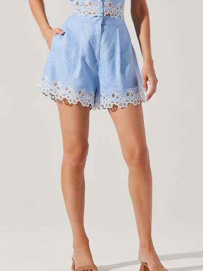 A high waist and soft pleats create an ultra-flattering fit on this linen style. Delicate embroidered lace and a scalloped hem add a romantic finish. Complete the look with the Kiya Top.