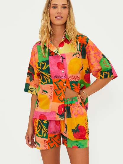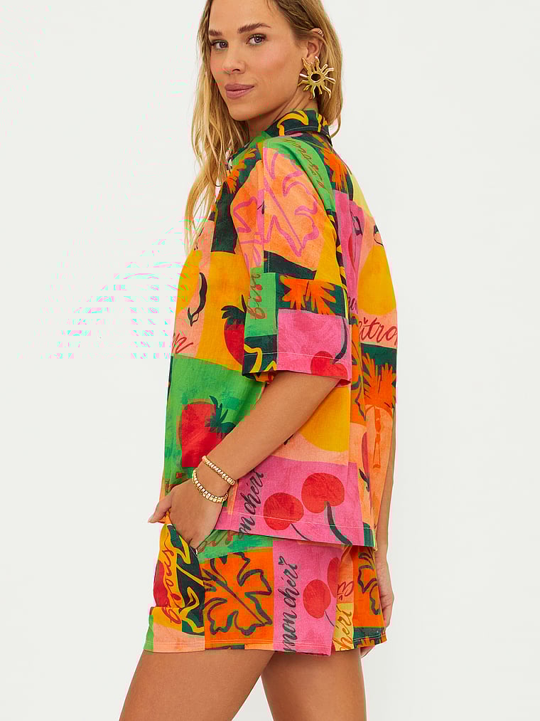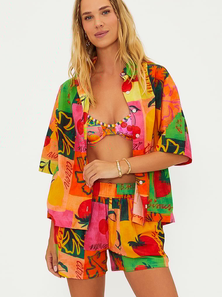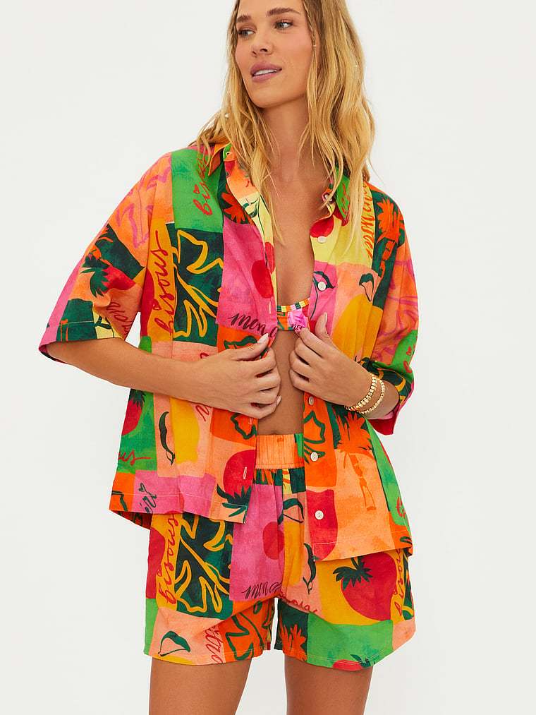 A bold, bright print and easy button-front closure make this shirt a great coverup for your favorite beach days.