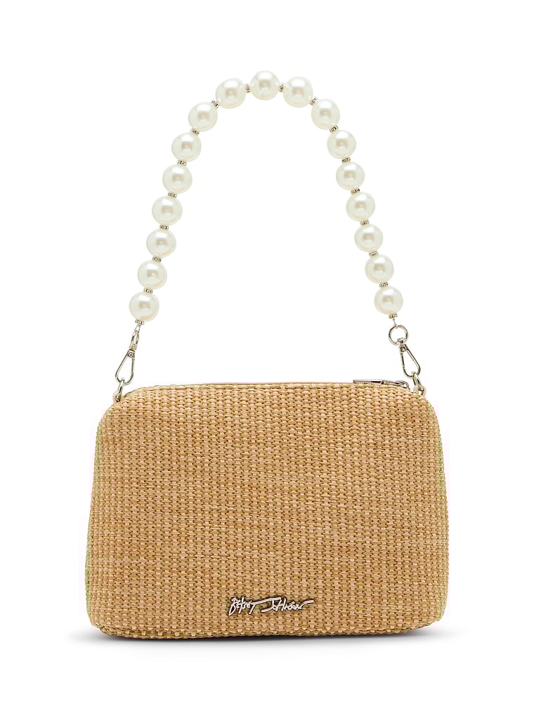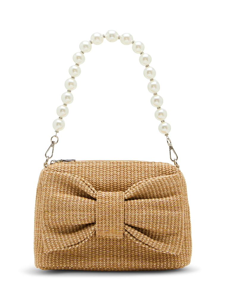 This straw bag features an oversized bow and pearl & rhinestone details on the handle.
