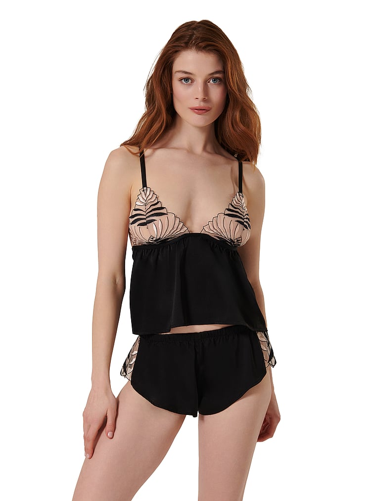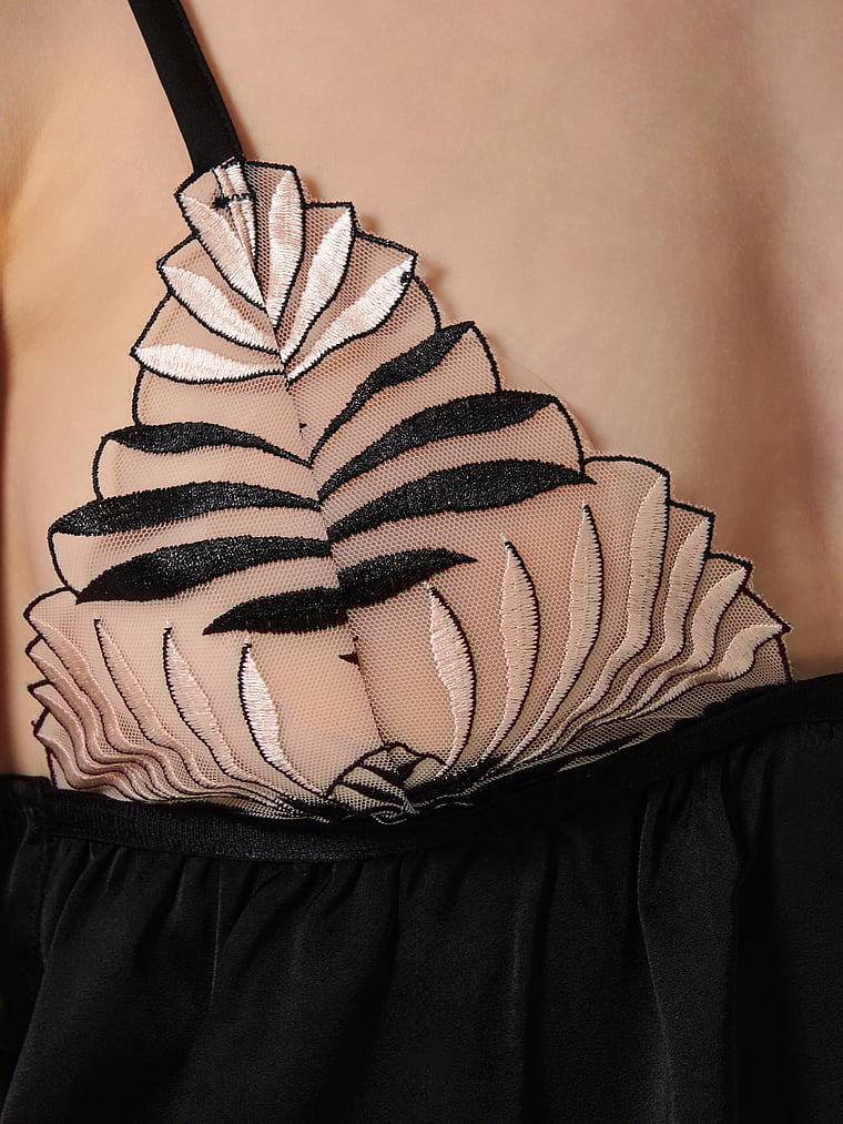 Lounge in luxury with this romantic, two-piece set. Artfully embroidered mesh, scalloped trim, and an effortless silhouette that drapes across the body exude an ultra-feminine feel. Pair with the Katerine Panty for the full look.
