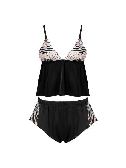 - Top: unlined, tri-tone embroidered cups, scalloped trim, elasticated under bust, adjustable straps