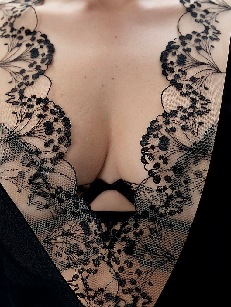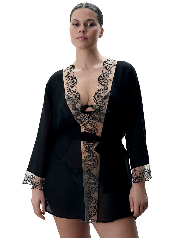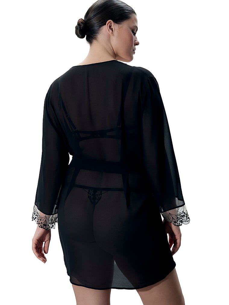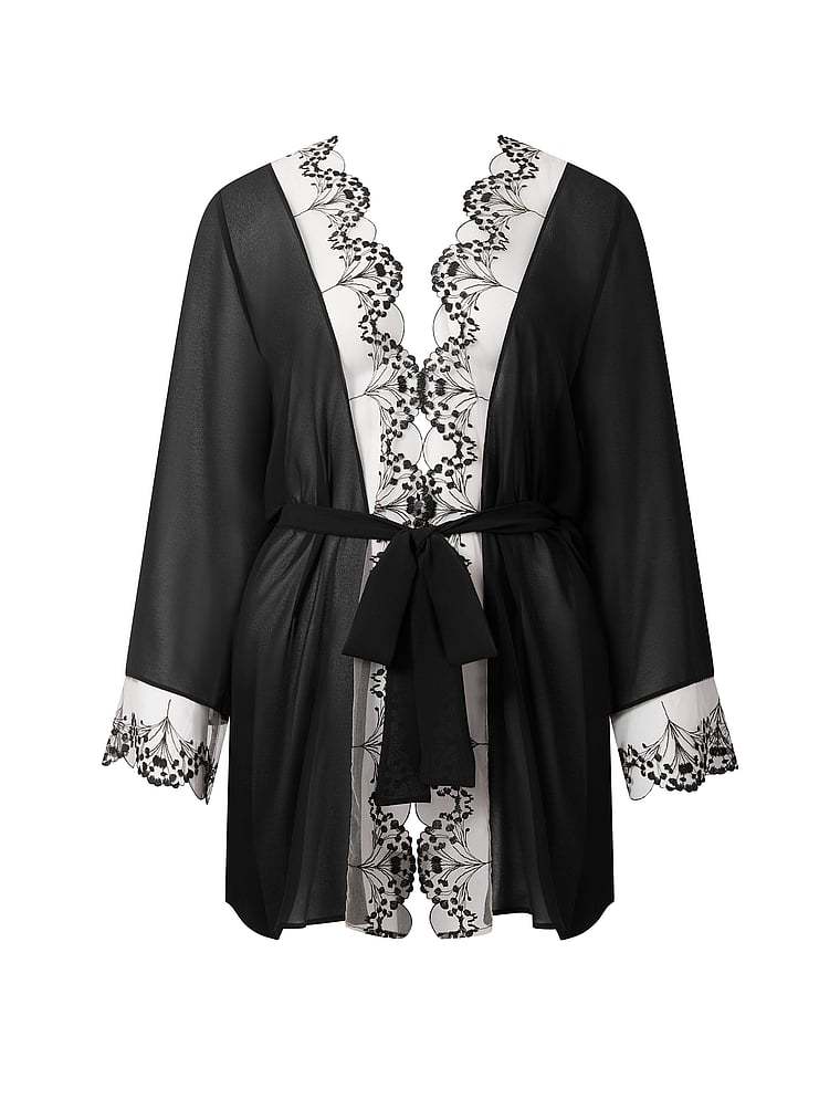 Refined glamour. This Kimono style offers a fluid drape for an elegant, intimate feel. Featuring intricate floral embroidery and a tie belt crafted from recycled materials.