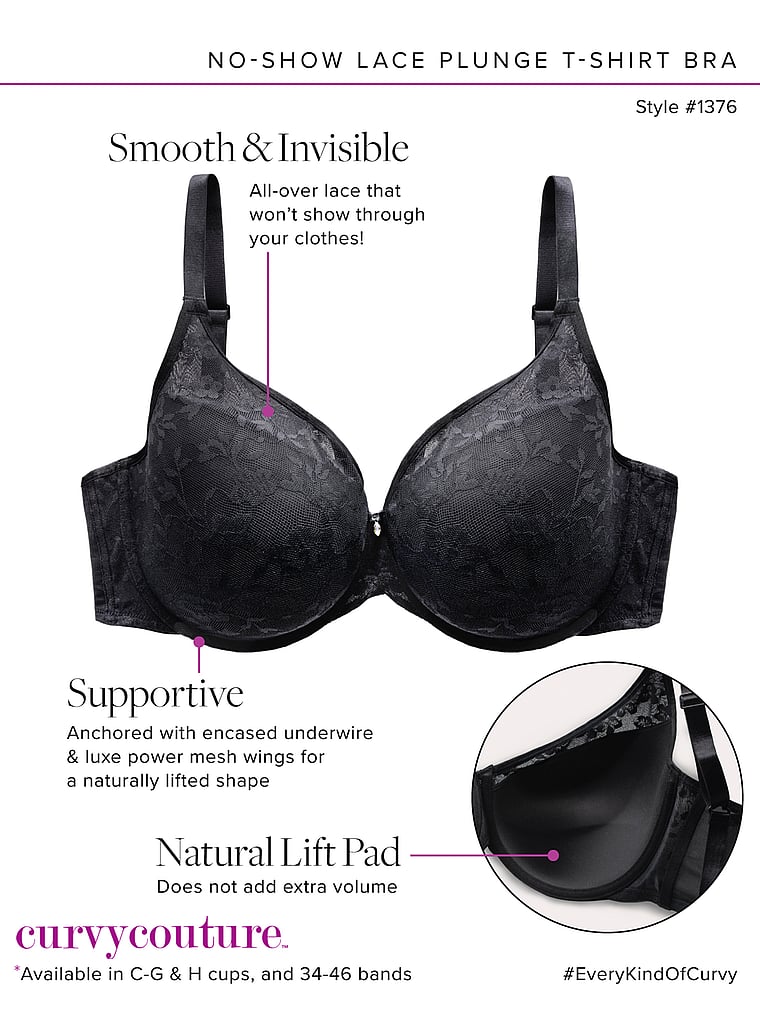 Designed with a smooth, allover floral lace, this style features Curvy Couture’s signature tulip pads that offer perfect coverage and a gradual lift that enhances your natural shape. A plunging neckline makes it a go-to under any outfit, but especially those with lower necklines.