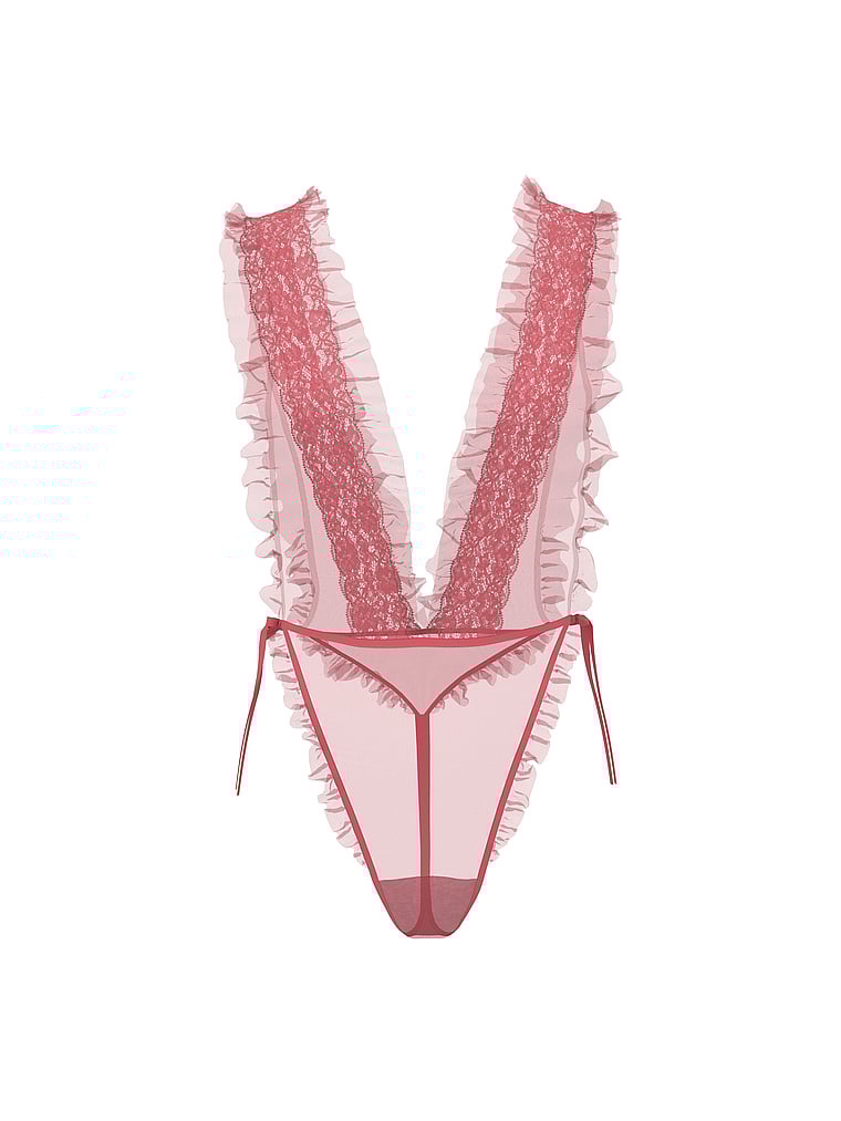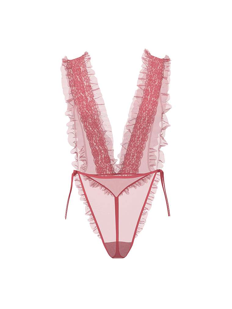 Sheer and super-seductive, this plunging design features gorgeous lace and flirty ruffle details. The lengthening, ultra high-cut leg finishes at the waist with adjustable satin ties.