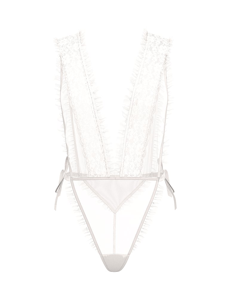 Sheer and super-seductive, this plunging design features gorgeous lace and flirty ruffle details. The lengthening, ultra high-cut leg finishes at the waist with adjustable satin ties.