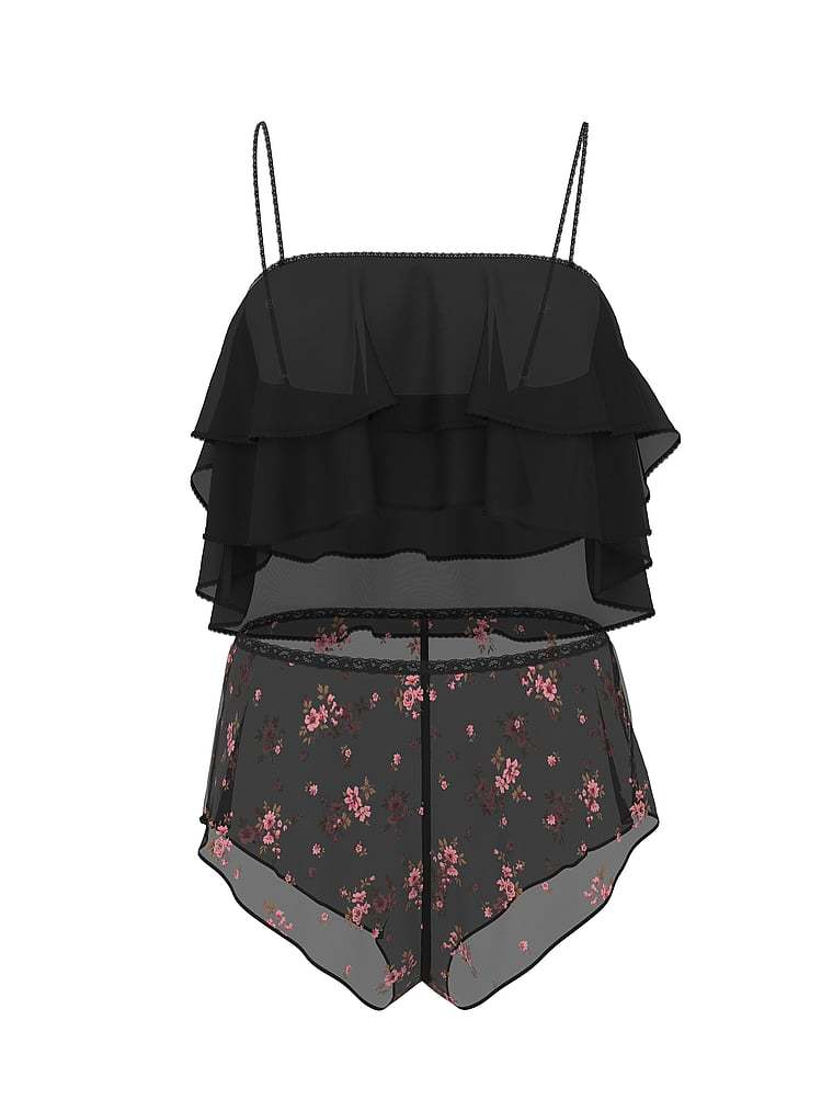 Tiers of sheer chiffon cascade from delicate straps to top off this romantic, flower-dotted Set. Fluttery Shorts with sexy side slits make the perfect match.
