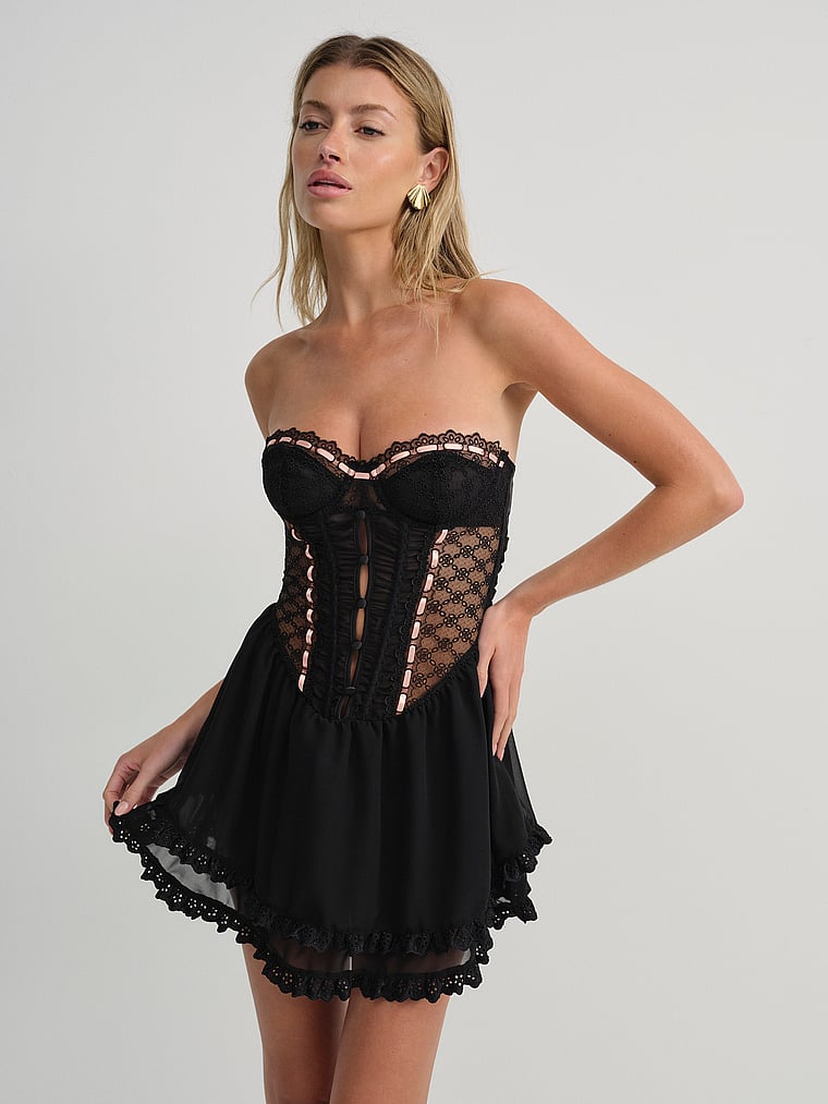 Designed for the modern muse, this made-to-be-seen, lingerie-inspired Slip Dress is adorned in a sexy, sheer eyelet embroidery. Underwire cups, a boned bodice, and full gathered chiffon Skirt add to the romance.