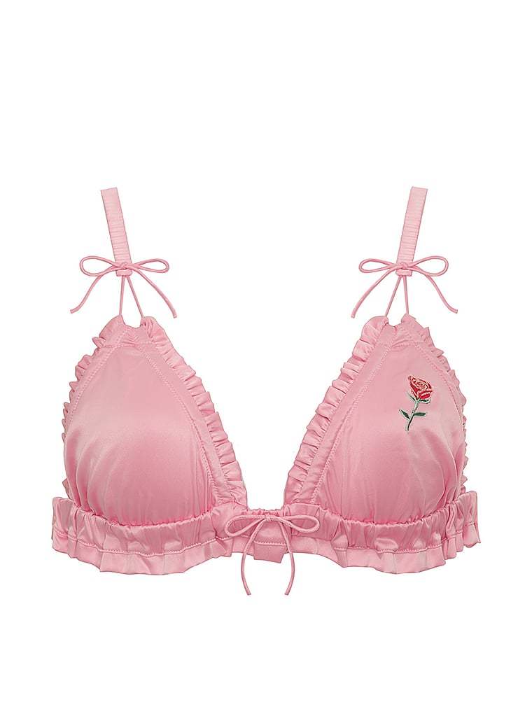 Dainty embroidered blooms detail this romantic style. Scrunchie-style straps and decorative picot bows complete the look. Pair it with the Everyday Thong Panty to complete the look.