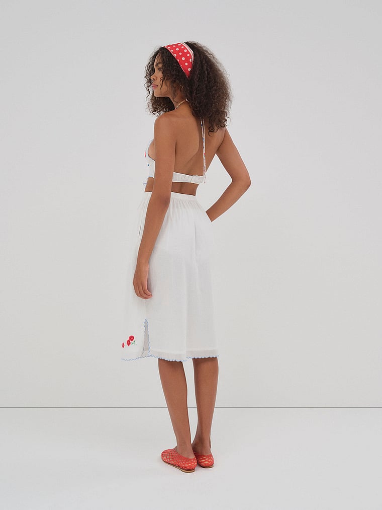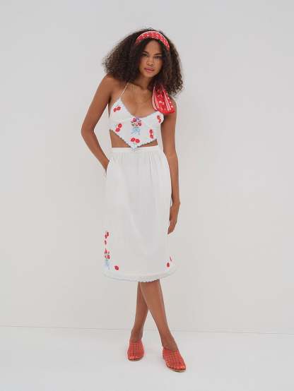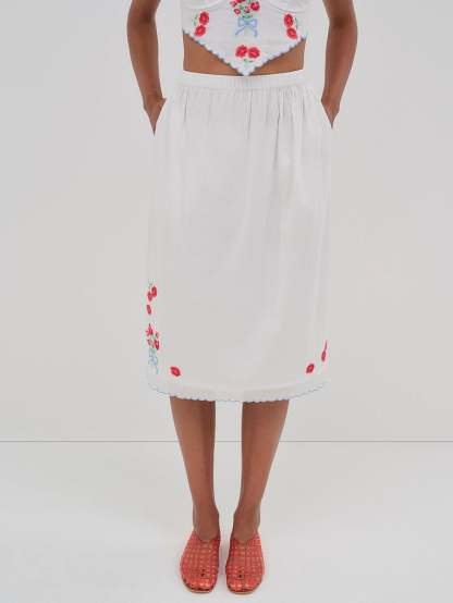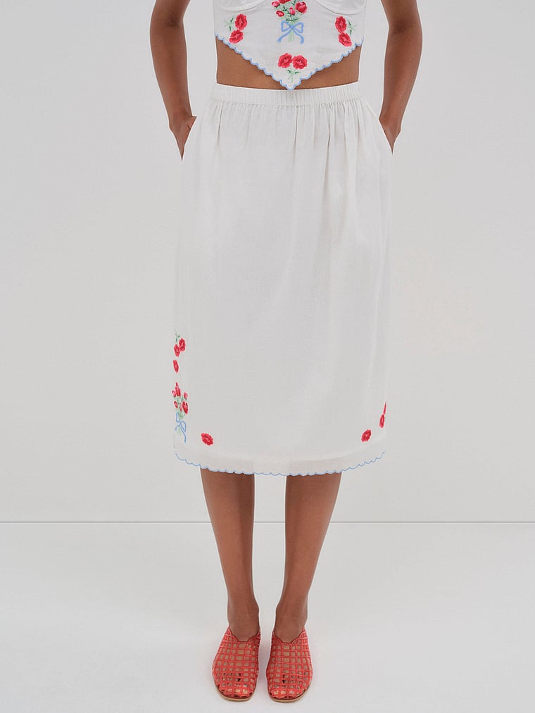 This muse-worthy, 100% cotton midi Skirt is adorned in floral embroidery and finished with contrasting scalloped trims. Pair with the matching Forget Me Not Top and Bloomer Panty for a coordinated look that’s brimming with romance.
