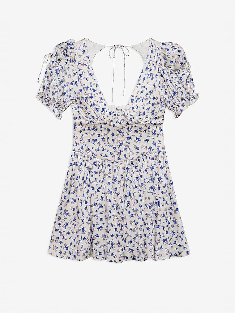 Fun and fresh in a retro floral pattern, this puff-sleeved piece is complete with a corset-inspired waist, flared skirt, and a plunge neckline with unique underwire shaping.