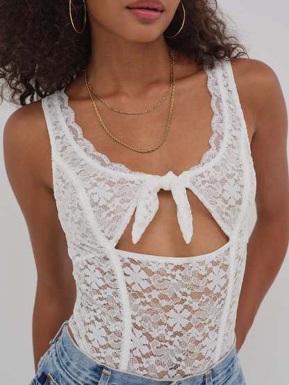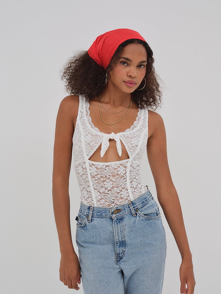 How to make your barefoot strolls through tall grass even dreamier: Wear this lacy, floral Bodysuit with your favorite Shorts or Jeans. A flirty cutout with a knot-tie detail completes the look.