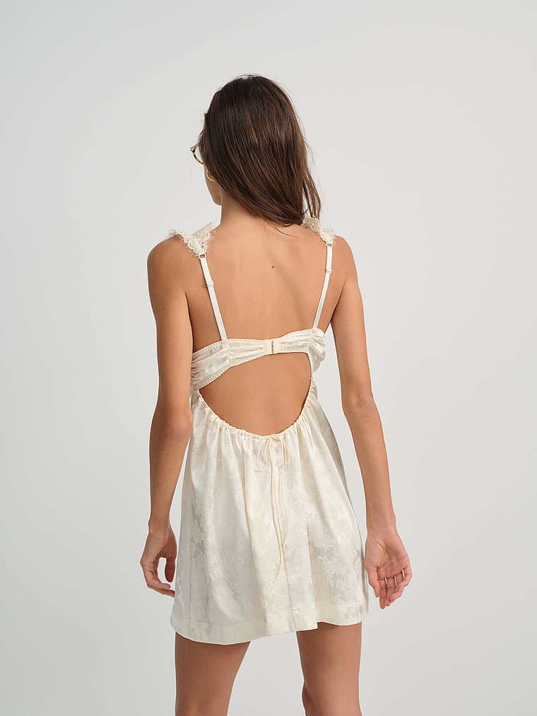 Soft, feminine style. This slip dress is crafted in a chic floral jacquard and adorned with lace trims. Featuring ruched underwire cups, a low drawstring back, and skinny chiffon tie bows plus rosettes throughout.