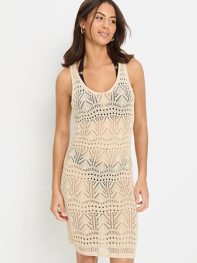 Semi-sheer and plenty sexy, this crochet mini dress is made of a soft openwork knit with comfortable wide straps.