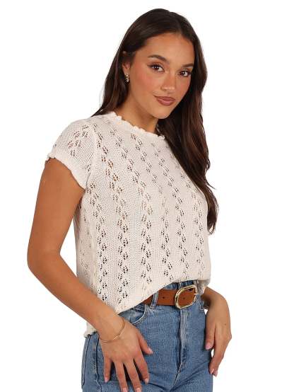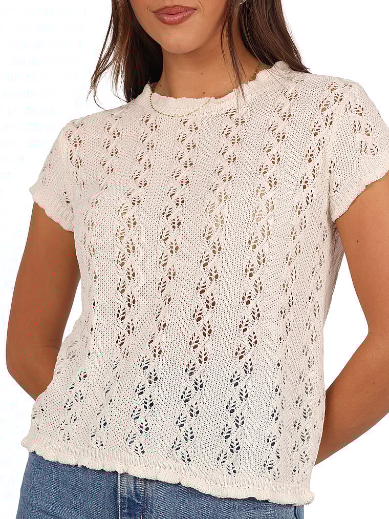 Delicate ruffle trim and sweet open-knit details give this chic Top an ultra-feminine feel. It pairs perfectly with Jeans and Boots (and adventures kissed by a late summer breeze).