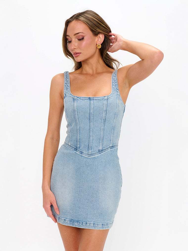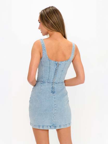 A corset-style bodice and a chic, square neckline create a flattering silhouette on this playful Mini. Crafted from a stretchy denim, it's the versatile essential you need for your summer wardrobe.