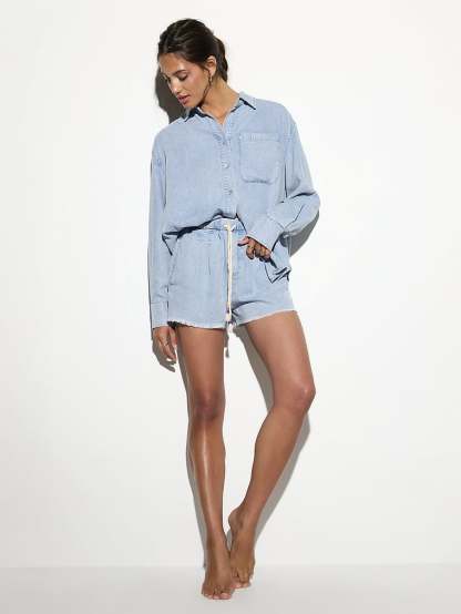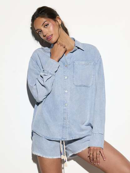 Beach days are just better in chambray. Crafted from 100% Tencel, this lightweight staple has all the classic details you love—a collared neckline, button-front closure, and an oversized fit. Pair with the Meadow Chambray Shorts for the complete look.