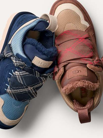 Recycled ballistic canvas mesh, Cow suede,Polyester mesh lining made from 55% coffee charcoal modified polyester and 45% regular polyester, 10mm UGGplush™ 60% upcycled wool, 40% lyocell lining, SugarSole™ EVA outsole