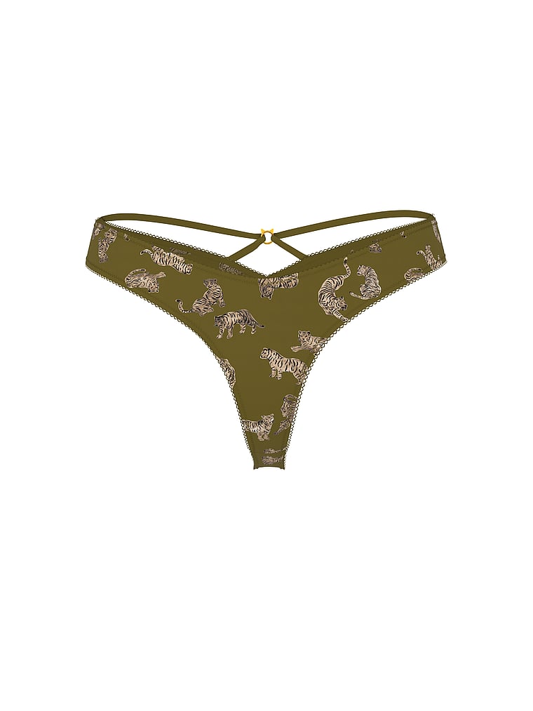 This silky Panty features a dipped front and turns around to reveal strappy details and a dangling charm.