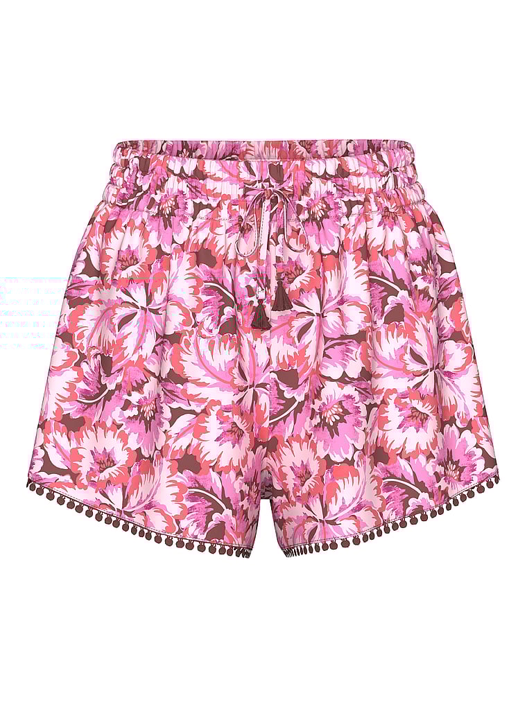 Decorative trim and a tasseled drawstring detail this short-and-sweet style, perfect for beach-to-brunch coverage.