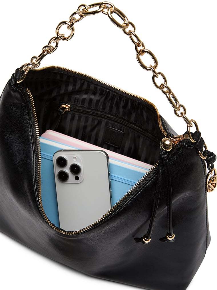 The chain-link strap on this medium size shoulder bag adds an eye-catching touch. Featuring an on-trend, curved silhouette with a spacious interior plus zip closures to protect your belongings. Crafted with smooth faux leather for a classic look.